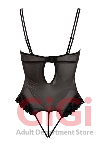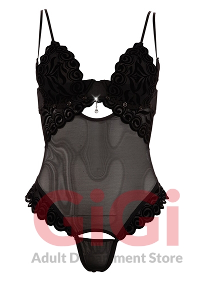 Black string body made of powernet with cups and string part that can be unbuttoned, rhinestone decoration in the cleavage area and two pairs of straps – both are adjustable and one pair can be removed with the cups. There is a slightly padded underwired shelf bra under the cups. Flock print on the cups and around the legs. Powernet: 90% polyamide, 10% elastane; flock print: 90% polyester, 10% elastane.