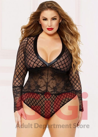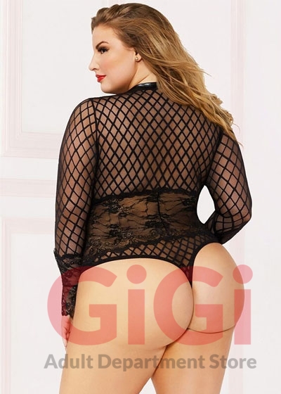 Geo mesh long sleeve teddy with lamé trim and snap crotch
