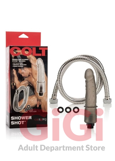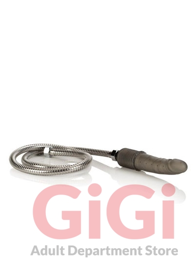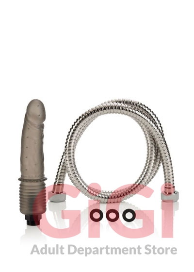 Removable, perforated, Jelly-soft, dong-shaped nozzle with non-tarnishing, nickel-free hose 16.5 cm x 3.75 cm (dong) 1.25 m (hose) Attaches easily to any shower Phthalate-Free PVC (dong) ABS (cap) Rubber (rings) Chromed Steel (hose)