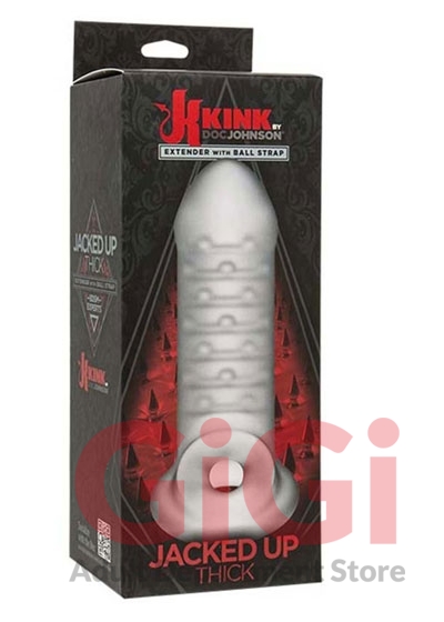 Make it big - slide into the Jacked Up Thick Extender for increased length and girth. Soft and stretchy to perfectly hug your shaft, Jacked Up Thick stretches eight inches from its ball-teasing base to a firm head in a sheer, frosted material that looks and feels incredible. The extender's ribbed, studded interior stimulates the penis, while the attached ball strap holds it in place and tugs at the balls for added pleasure with every thrust. Kink by Doc Johnson is an exciting collaboration with Kink.com to create a collection of high-quality authentic fetish items suitable for long-term practitioners and new initiates alike. From Doc Johnson.