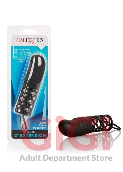Silicone 2 inches Extension Black from Cal Exotics. A perfect fit is all yours with this stretchy and comfortable delight. Added length means added pleasure. You will reach every sensual spot for the ultimate bedroom adventure. As simple to clean as it is easy to use, you will find cleaning a snap. As simple to clean as it is easy to use, you will find cleaning a snap. Bulk weight 3.4 ounces. Materials Silicone. Measurements 5.75 inches by 1.75 inches extension.