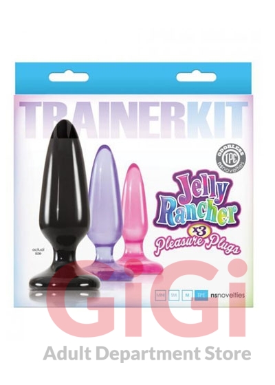 Jelly Rancher X3 Pleasure Plugs Trainer Kit Multicolor. Your training starts now! Featuring three sizes of flexible anal plugs, Jelly Ranchers Trainer Kit provides an enjoyable way to expand your sexual limits. The plugs have strong suction cups and can be used with all lubricants. Material Silicone. Color Multicolor. Product dimensions mini plug 3.2 inches by 1.7 inches, small plug 4 inches by 1.7 inches, medium plug 5 inches by 2.1 inches.