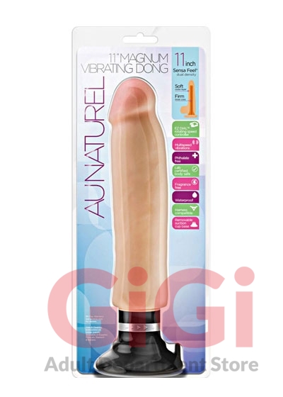 Au Naturel 11 inches Sensa Feel Magnum Vibrating Dong Beige. Do you feel like having a big one? The 11 inches Magnum Vibrating Cock is made from our proprietary dual density Sensa Feel. It is soft skin and firm shaft feels so realistic you would not be able to tell the difference. Featuring a strong suction cup base with an integrated multi speed dial controller you can stick the Magnum on any smooth flat surface like the shower wall or on the floor and ride the Magnum as it vibrates inside of you. How does that sound? Made from body safe and fragrance free Thermoplastic TPE. Features: feel. Soft realistic look and feel.Versatile. Strong suction cup base, our suction cups will stick to all smooth flat surfaces! It is also harness compatible. Power. Strong multi-speed vibrations with the twist of a dial. Large size with 12.5 inches of total length, 11 inches of insertable length and 2 inches of width. Peace of mind. Made from body safe materials and meets or exceeds CE and ROHS international safety standards. Phthalate, fragrance and latex free. Magnum Vibrating Dong requires 2 AA batteries, not included. Sold separately.