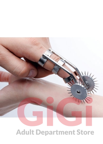 Now you can always have sensation play at the tip of your finger! This unique take on a Wartenberg Wheel allows you to wear two pinwheels on a ring-like device. The smooth rolling motion upon your lovers skin will produce a prickly, painful pleasure that will give them goosebumps. Blindfold them to heighten the stimulation as your surprise them with every touch. This durable instrument is secure on most fingers due to its three-ring design.