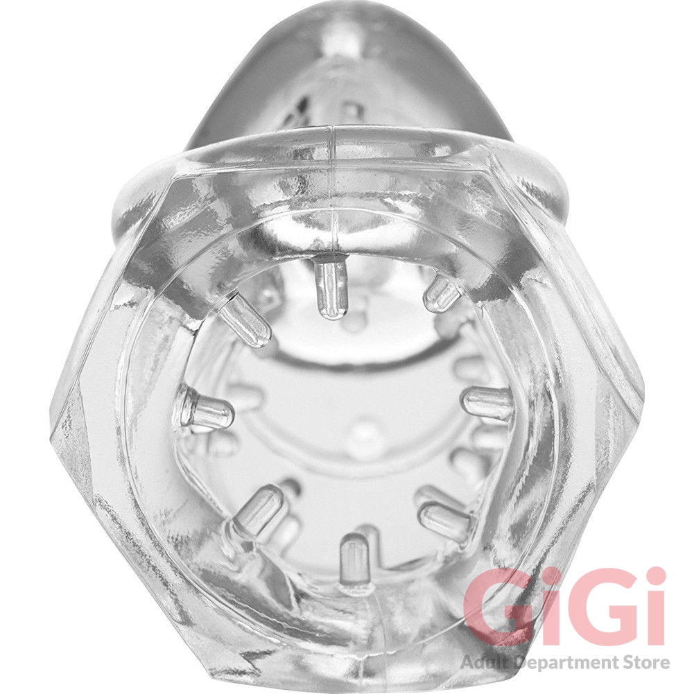 The new version of the Detained Soft Body Chastity Cage as has all the benefits of its predecessor in a smaller design! Also new are the internal nubs for teasing your slaves cock while it is trapped in chastity without release! This all-rubber chastity device is the best way to experience erection restriction in discreet and flexible comfort. Featuring a stiff-walled rubber cage with a cum-through opening and separate cock and ball chambers this soft body device is nearly undetectable under clothing. The low profile and travel-friendly material make it ideal for trips through metal detectors and it is comfortable enough for long-term wear. Measurements: 3 inches in total length unstretched. 1.10 inches internal diameter unstretched. Material: TPR. Color: Clear.