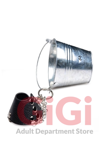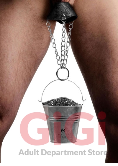 Weigh down that ballsack one pebble, coin, or drop of water at a time! Screw with your playthings body and mind when you wrap their scrotum in this leather-like parachute and hang a bucket from the three chains. CBT enthusiasts will love the customized sensations as you get creative, filling the Master Series bucket with anything your wicked mind desires. How much can your masochist handle? Find out with this durable design, or remove the bucket and attach a leash or other BDSM accessory for even more versatility.