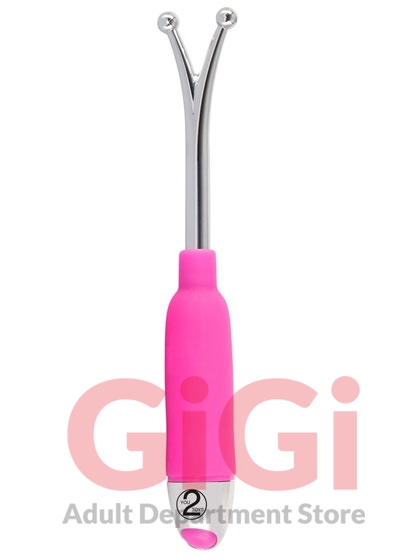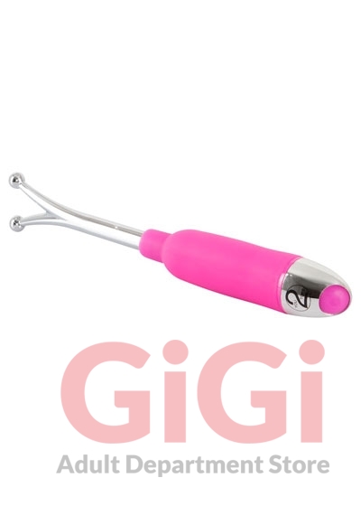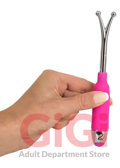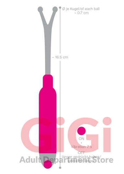 A special vibrating wand with two ball-shaped tips for spot-on clitoral, nipple and glans stimulation. With 7 vibration modes. Complete length 16.5 cm. Pink/silver-coloured. Metal, silicone, PU coating. Includes batteries (3 x LR44).