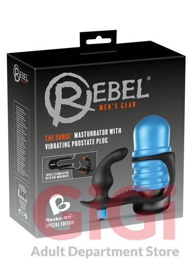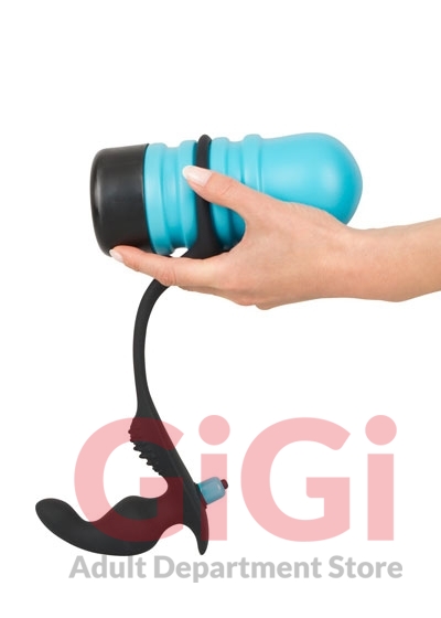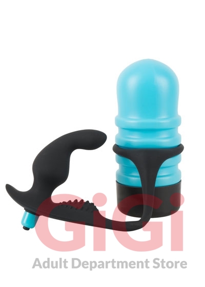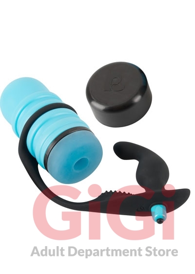 3-in-1: masturbator with a removable anal vibrator. The blue masturbator has a dotted and grooved pleasure tunnel and can also be removed from the blue case. The masturbator is open at the end. The black anal vibrator has a velvety soft surface, 10 vibration modes and is specifically designed for P-spot stimulation. The vibro-bullet is removable. The anal vibrator is joined to the masturbator by a flexible connection strap. This connection strap can also pleasure the perineum, thanks to its stimulating dots. Furthermore, the anal vibrator is removable and this means that both toys can be used separately.