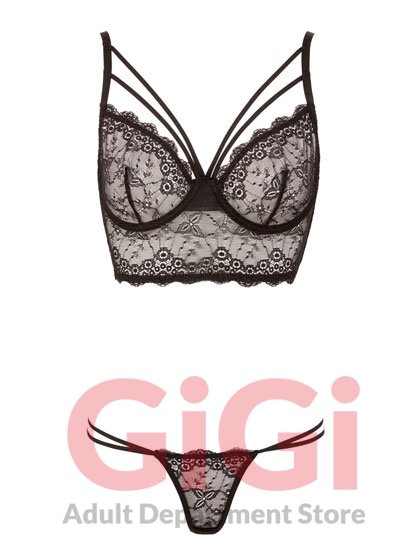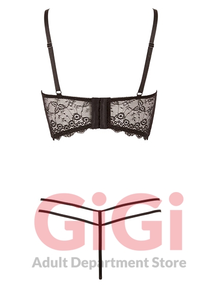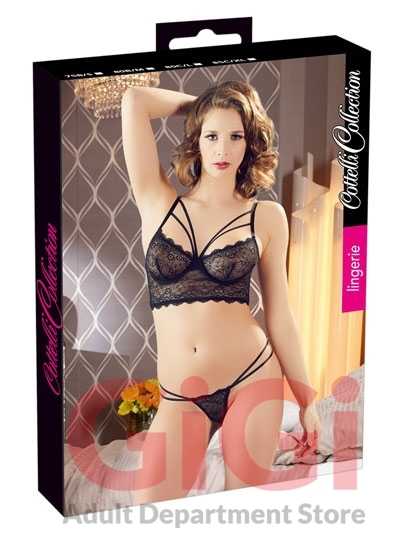 A set made up of a black bra and matching string. The underwired bra has lace cups, stretchy decorative straps above the cups and a wide strip of lace underneath the cups. With a hook-fastener at the back. The straps are adjustable. There are double straps either side of the lace string. 90% polyamide, 10% elastane.