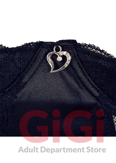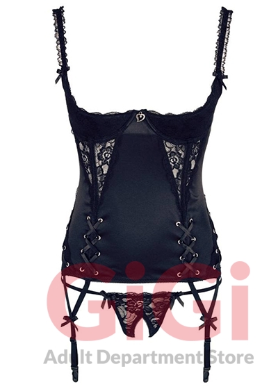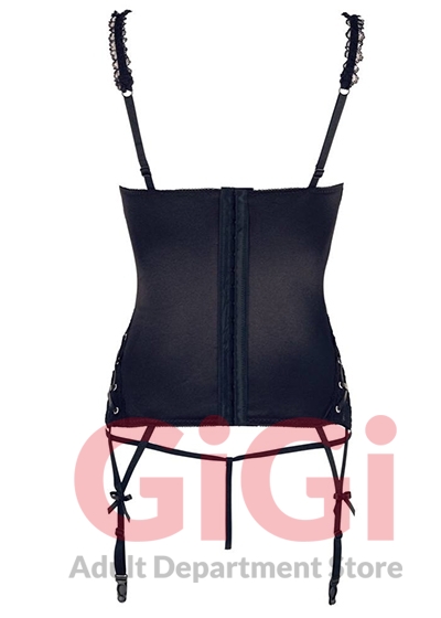 Black corsage with suspender straps. The corsage is made out of satin and has beautiful lace inserts, slightly padded shelf bra cups, bones and a small heart-shaped pendant at the front. Bra and suspender straps are adjustable. Includes a crotchless lace string. 90% polyamide, 10% elastan. Without stockings.