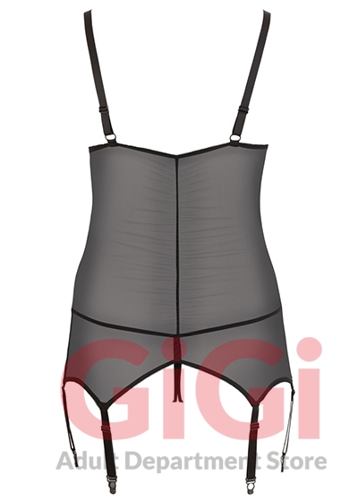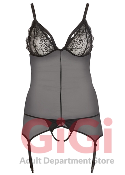 Basque made out of transparent black powernet with ruffles at the front and the back, and removable lace cups that can be unbuttoned. There are also three adjustable suspender straps per side. Includes a crotchless string. 90% polyamide, 10% elastane. Without stockings.