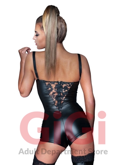 A body made out of shiny matte wetlook with lace on the cups and a sexy lace insert at the front and the back. There is an inviting zip in the crotch area. The zip at the back means that the outfit can be put on and taken off really easily. The straps are adjustable. Very stretchy power wetlook made out of 80% polyamide and 20% elastane.