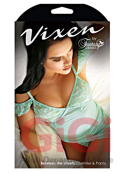 Between the Sheets is where secrets are kept, promises are made and desires are fulfilled. This sultry chemise features an off the shoulder look, dainty floral lace and soft mesh fabric. Finished with a g-string in a delicate shade of aqua.
