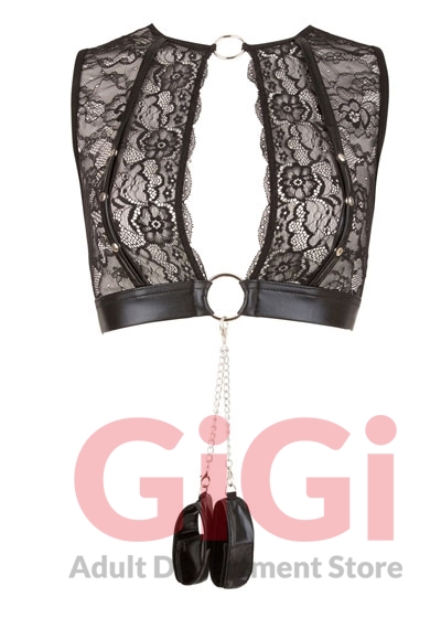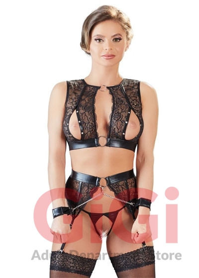 Top, suspender belt and crotchless string made out of transparent lace and black wet look. The highlight: the press studs over the breasts that are extremely easy to undo and the handcuffs with hook and loop fasteners that can be quickly attached to the decorative rings on the top or the suspender belt with the snap hooks. This means that this lingerie set can quickly be turned into a special bondage set for beginners!