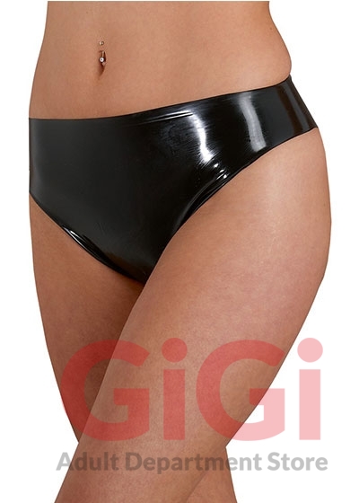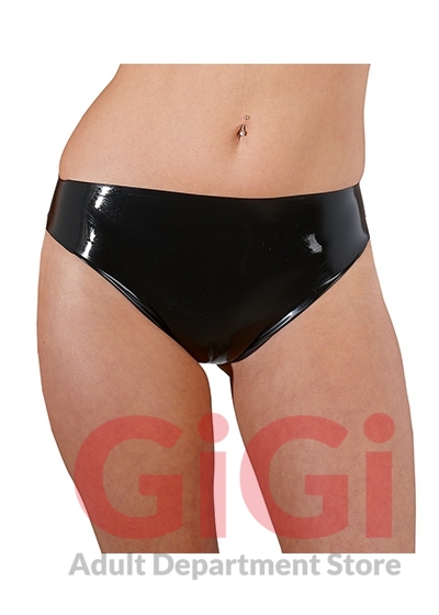 Black latex briefs. Flat dipped. Material: 100% latex that is made from natural rubber latex which may cause allergies.
