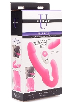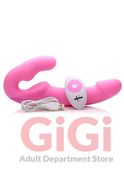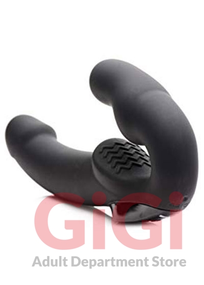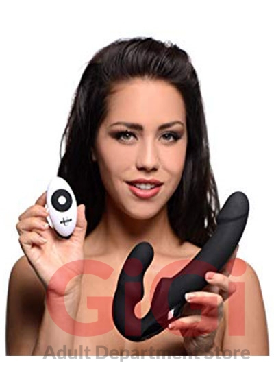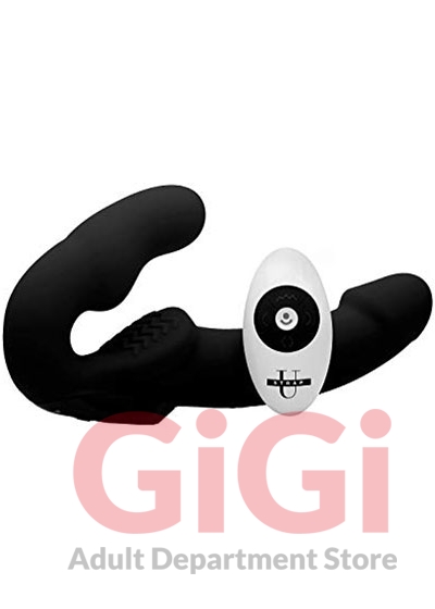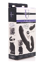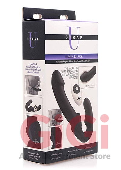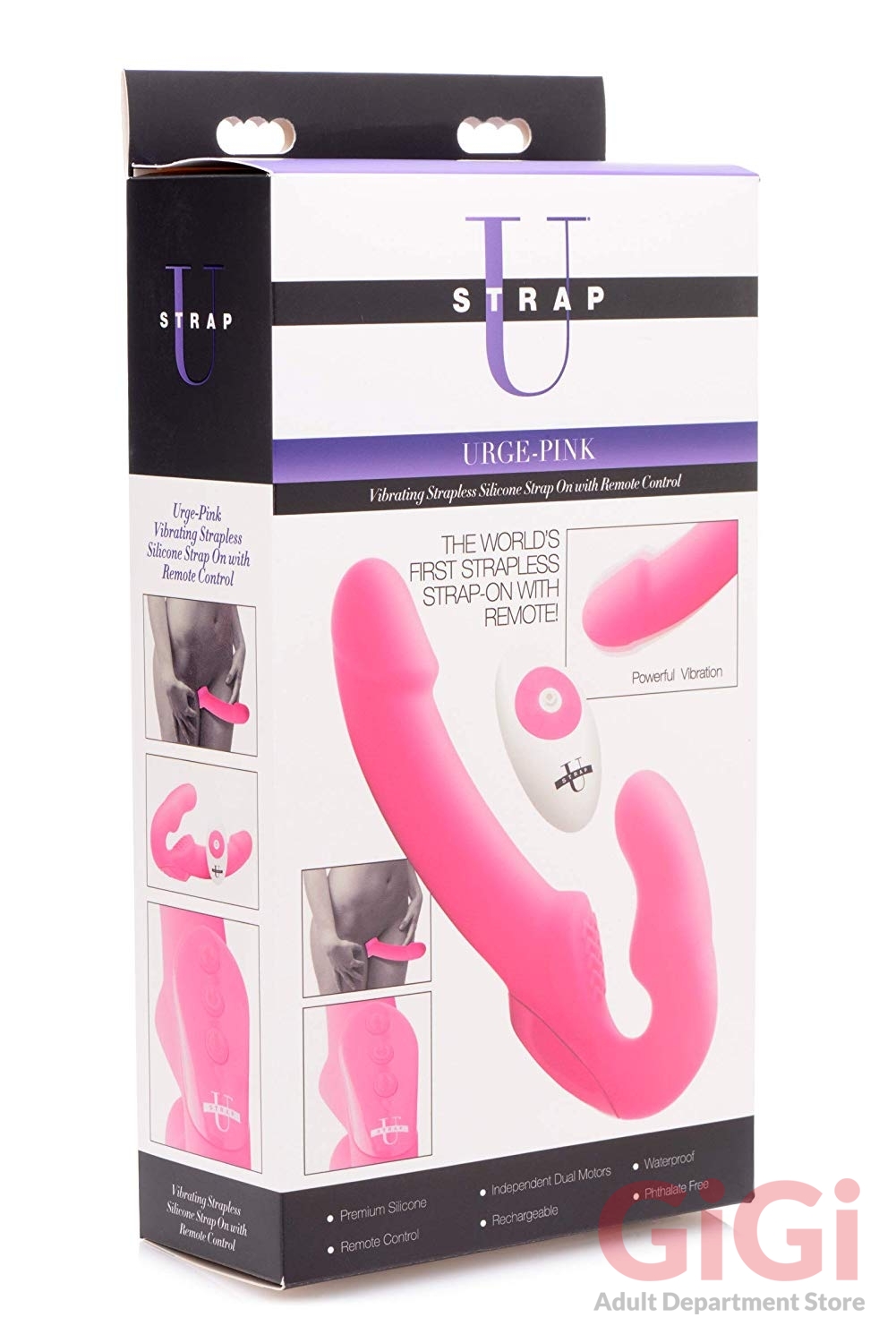 The first strapless strap-on with a remote control in the world, this couples toy provides more convenient vibrating pleasure during pegging or penetration that does not involve a penis. The shape allows one partner to insert the smaller end vaginally, holding it with their kegel muscles or adding a harness for extra support. A pad with ridges provides clitoral bliss as they grind against it. Meanwhile, every thrust will send the long, smooth shaft into their partner. The curves on both ends target the G-spot or P-spot for direct stimulation. Independent dual motors are easily controlled via the panel on the front of the Urge, or with the handy remote control! Explore 3 speeds of buzzing and 5 patterns of pulsation for each partner. It is even waterproof for wet, hot fun in the bath, shower, or pool. Made of premium silicone, the Urge is non-porous, phthalate-free, and thoroughly sanitized with mild soap and warm water. Preserve the material by avoiding use with silicone lubricant.