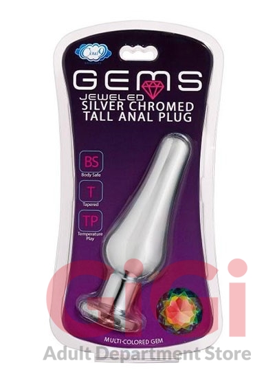 Cloud 9 Gems Silver Chrome Tall Anal Plug Small. New Gems Silver Chromed Anal Plug Tall Tapered Design. Plug with anal jewelry decorated with a stunning rainbow multicolored gem. Hypoallergenic, nonporous, odorless and body safe. Tapered for intense pleasure. Great for beginners. Anal Jewelry decorated with a stunning rainbow multi-color gem. Silver chromed wearable plug featuring a jeweled beauty for your booty. Cloud 9 Jeweled Gems. Features a delicate tapered tip. Perfect for beginner use. Hypoallergenic, nonporous, odorless, and body safe. The tapered tip makes it easy to insert, and the flared base keeps its place and allows for easy retrieval. The sparkling jewel makes playtime fun. This Cloud 9 Jeweled Anal Plug is excellent for temperature play when you prepare it in hot or cold water. This Cloud 9 Gem anal plug is both visually stunning and ideal for stimulating anal play.