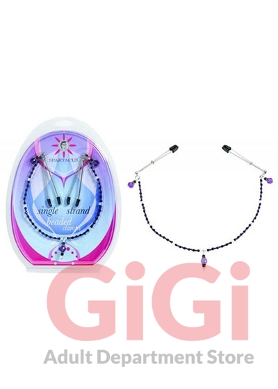 Spartacus Purple Single Strand Deluxe Beaded Nipple Clamps are sensual accessories intended to complement fine lingerie. A bondage toy that is beautiful and feminine, these single-strand beaded nipple clamps are a must have for your toy box. The adjustable tweezer style clamps can be tightened with a slide of the small adjustment rings, and can also have their rubber tips removed for more powerful sensations. In the center, a lovely beaded string alternates translucent color and black beads, and is accented with faux gem dangles at each end and the center. When worn, these decorative touches rest below each nipple and on the midriff.
