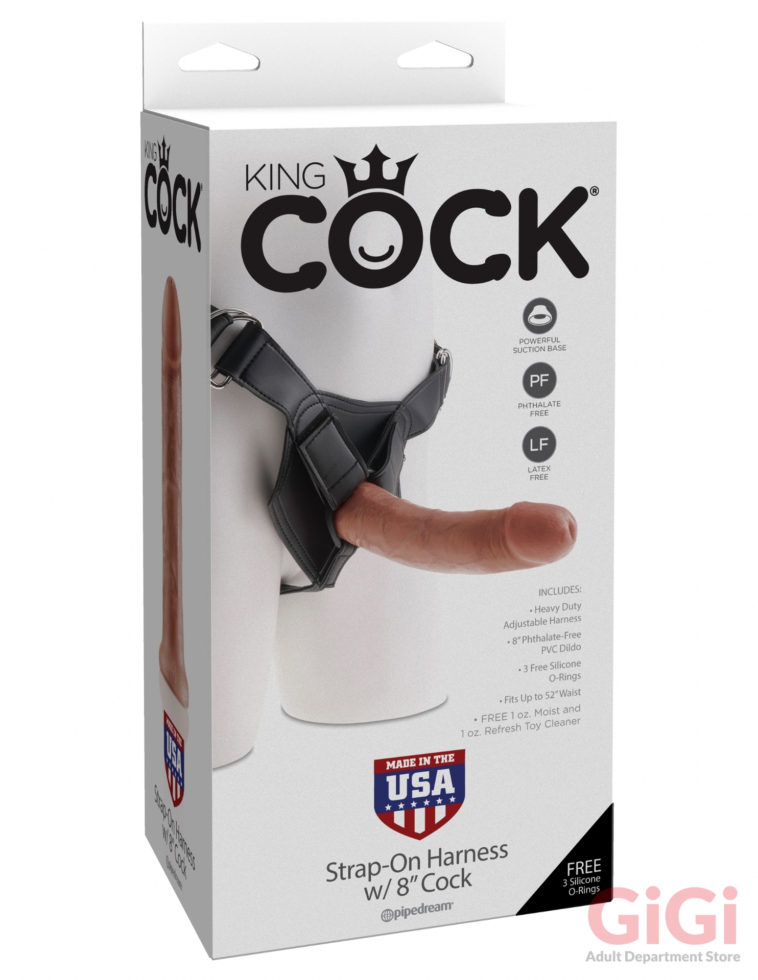 When you want your first strap-on to look and feel just like the real thing, the King Cock Strap-On Harness is just what you`v been looking for! Every vein, every shaft, and every head is carefully handcrafted with exquisite detail to give you the most realistic experience ever imagined. The wide suction-cup base fits snug into the harness for a secure fit and can even be used without the harnessstick it to any smooth, flat surface for wallbanging fun. Made in Pipedream`s state-of-the-art rubber manufacturing facility, every King Cock is phthalate-free, latex-free, body-safe, and hypoallergenic. The heavy-duty vinyl harness keeps everything in place even when the action heats up. The form-fitting design hugs your body`s contours and gets even softer and more fitting with each use. With a completely adjustable thong strap and waist straps, it comfortably fits waists up to 52. The metal belt buckles ensure that it won`t come loose during the fun, while the Velcro straps hold the O-ring securely in place. Gently spot clean with toy cleaner and warm water and lay flat to dry.