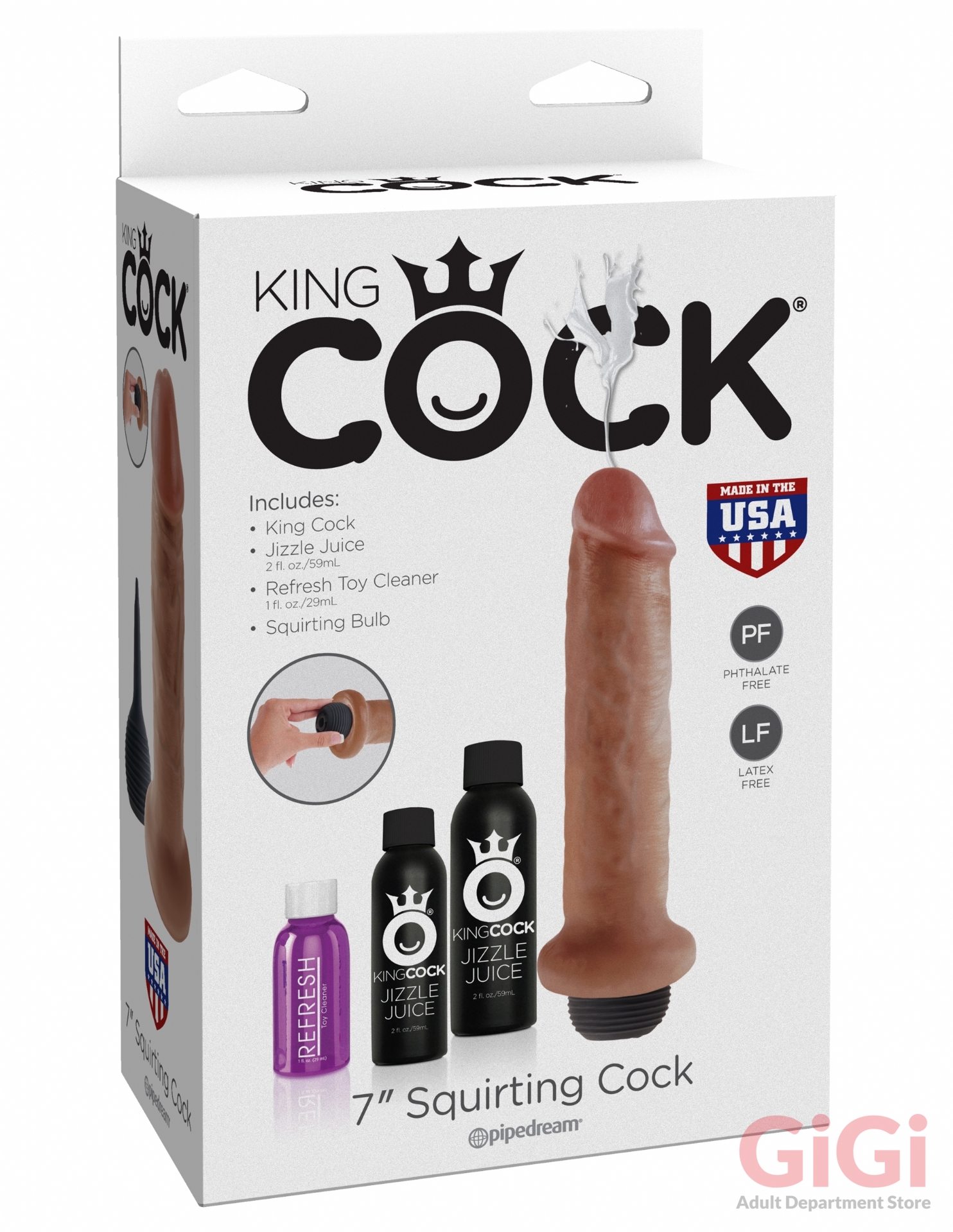 This King Cock Squirting Cock is ultra-realistic and will satisfy all of your cravings for cum-play! Hand-sculpted with amazing attention to detail and featuring our exclusive Jizzle Juice squeeze-bulb, the King Cock Squirting Cocks are the most satisfying ejaculating dildos on the market! Every King Cock is phthalate-free, latex-free, body-safe, hypoallergenic, and proudly made in the USA.