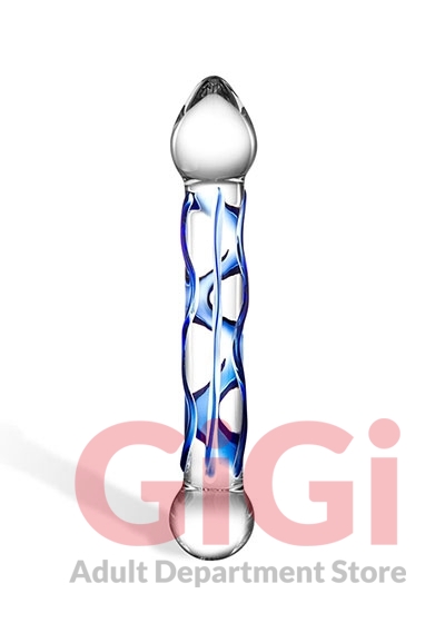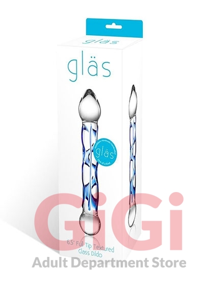 Glas 6.5 inches Full Tip Textured Glass Dildo. Searching for a thrill? The Full Tip Textured Glass Dildo from glas is an artistically created adult toy that offers a complete, sensual experience. Carefully crafted in dazzling clear and blue glass, this dildo is an impressive addition to any experts collection, as well as a unique way for beginners to start their sexual exploration. The Full Tip Textured dildo features a pronounced head at its tip for increased stimulation. This product is made from dependable, body safe borosilicate glass and is compatible with every type of lubricant. It is easy to clean with a quick rinse of soap and water. The Full Tip Textured dildo also retains temperature, granting it the ability to stay warm or cold for adaptable pleasure. This adult toy is 6.5 inches in total length and compatible with all lubricants.