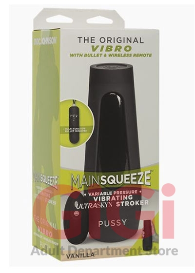 Doc Johnson's Main Squeeze line of hard case masturbators is designed to put the power in your hands, featuring a squeezable grip that lets you vary the tightness of each stroke and a suction-adjusting end cap. Featuring a perfect lifelike pussy opening, this ULTRASKYN™ stroker looks and feels real and is whoever you want her to be. Vibro's vibrating bullet only needs to be removed to power off its battery for storage, and each ULTRASKYN™ sleeve features a different textured interior to make every experience as unique as the real thing. The double-cap hardshell design doubles as a discreet travel and storage case, keeping your Main Squeeze fresh and ready for whenever the mood strikes.