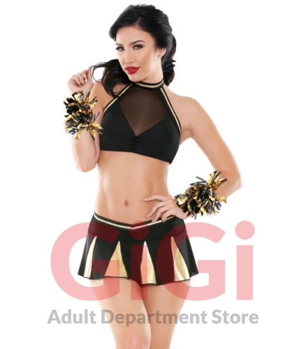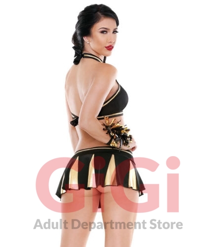 Gimme an "F!" Be the ultimate Crowd Pleaser with our hot cheerleader costume set. This sexy costume comes complete with a gold trimmed halter neck, metallic pleats and pom pom wristlets. Cheer on your favorite teammate in the sexiest bedroom cheerleader costume you've ever seen! Fabric Content: 90% Polyester, 10% Spandex. From Fantasy Lingerie.