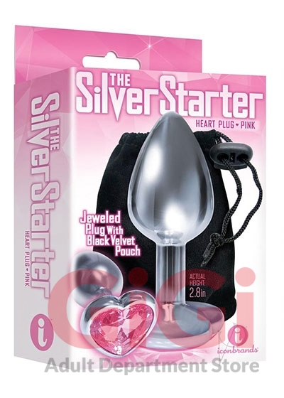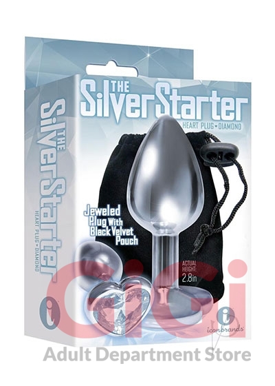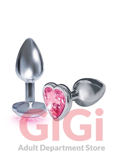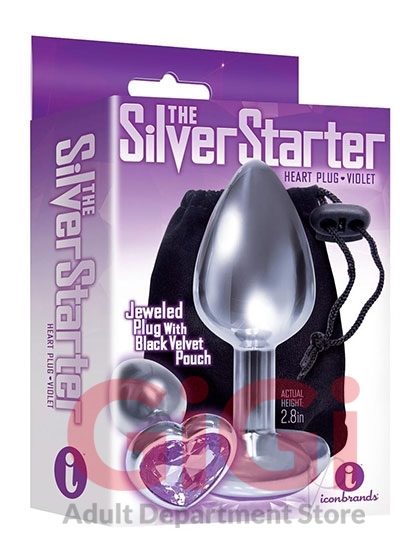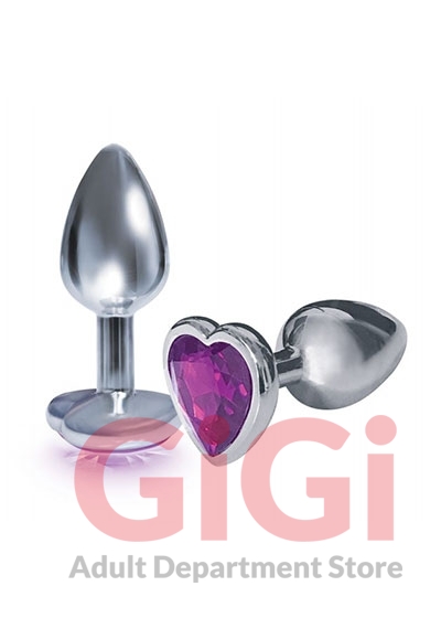 From the Nines collection Silver Starter Heart Bejeweled Steel Plug with Violet Purple Stone on its end. Sleek chrome metallic body and glitzy heart shaped bejeweled base on the anal plug perfect for beginners, designed and sized for easy insertion. Non-porous, easy to clean. Body safe stainless steel. Actual height 2.8 inches. Includes black storage bag.