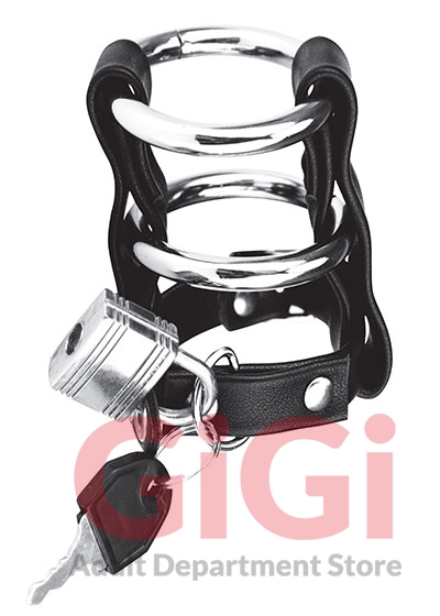 Lock and load! Designed to contain erections, this locking leather and metal cock lock hugs the cock and balls, while the shaft is contained by the metal ring. 100% PU; metal ring