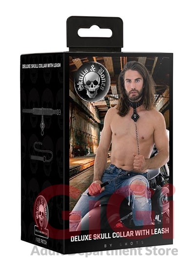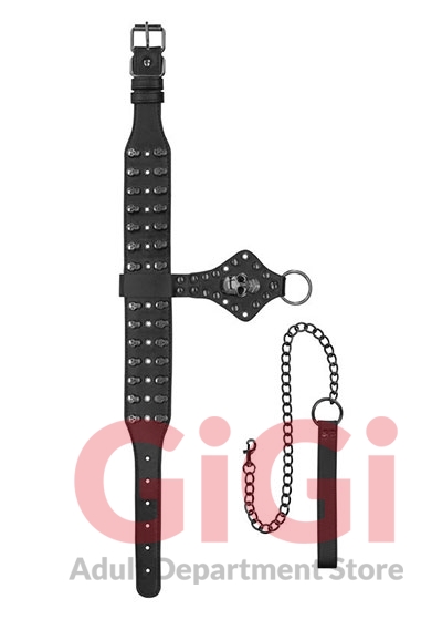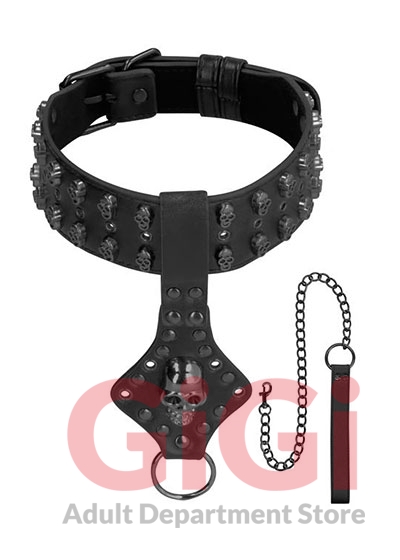 Ouch! Skulls and Bones Neck Chain with Skulls and Leash Black