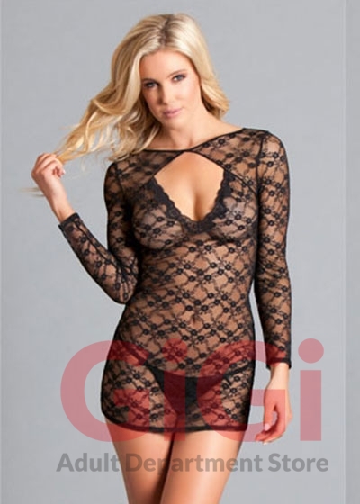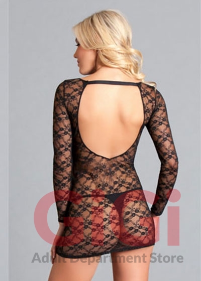 Lace Long-sleeve Slip. Sheer lace with long sleeves and an open back. Hand wash. Imported nylon/spandex. Box packaging.