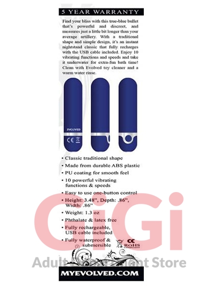 Find your bliss with this true blue bullet that is powerful and discreet, and measures just a little bit longer than your average artillery. With a traditional shape and simple design, it’s an instant nightstand classic that fully recharges with the USB cable included. Enjoy 10 vibrating functions and speeds and take it underwater for extra fun bath time! Clean with Evolved toy cleaner and a warm water rinse.