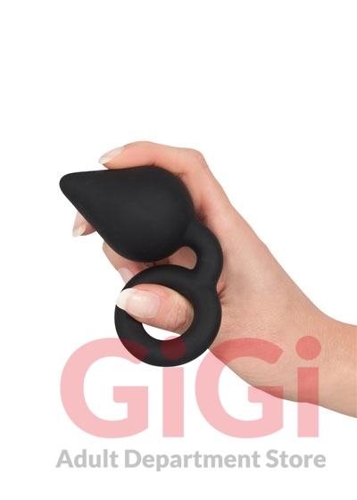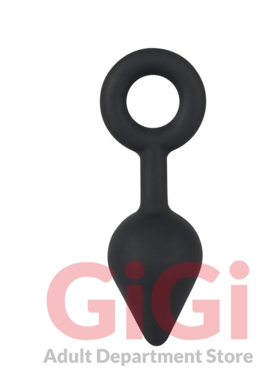 Black butt plug in a droplet shape. With a flexible neck and retraction ring. Soft touch surface. Complete length 14 cm, insertion depth 6.5 cm, Ø 4.5 cm. Silicone with a PU coating, phthalate-free according to EU Regulation REACH.