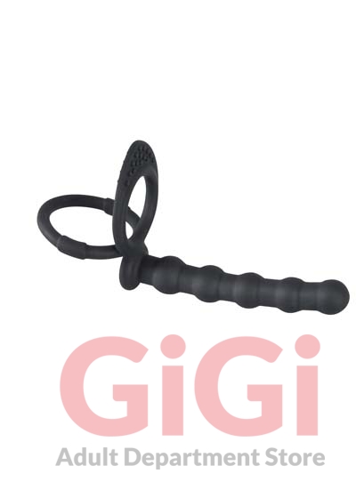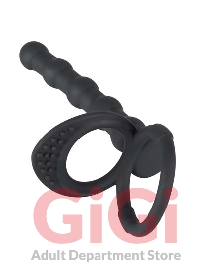 Black Velvets Cock & ball ring includes a cock ring with small dots, a ball ring and integrated flexible anal beads. Along with its smooth surface it's sure to impress. The complete length is 19 cm. The anal beads have a length of 12.5 cm and a diameter of 2.3 cm. The cock ring has a diameter of 3.8 cm, the ball ring has a diameter of 5 cm. Silicone with a PU coating, phthalate-free according to EU Regulation REACH.