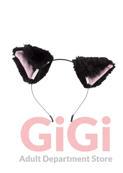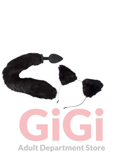 Black set consisting of a butt plug with cat tail and a headband with cat ears (pink on the inside).