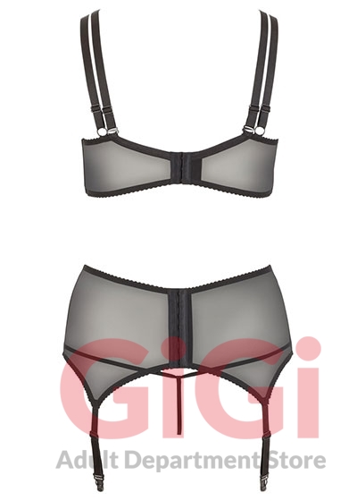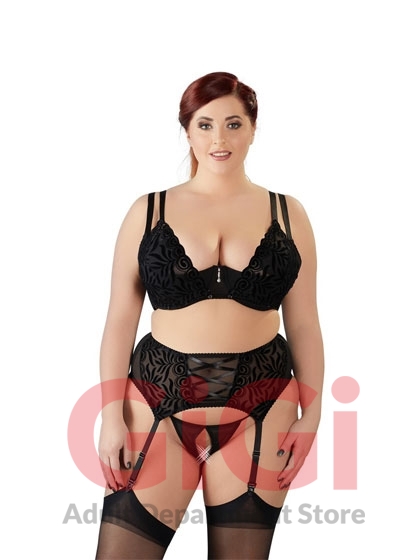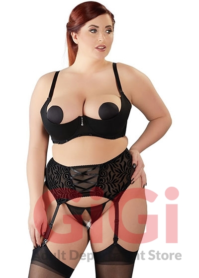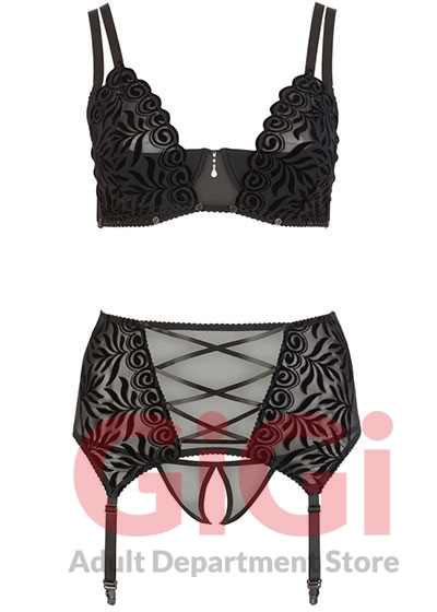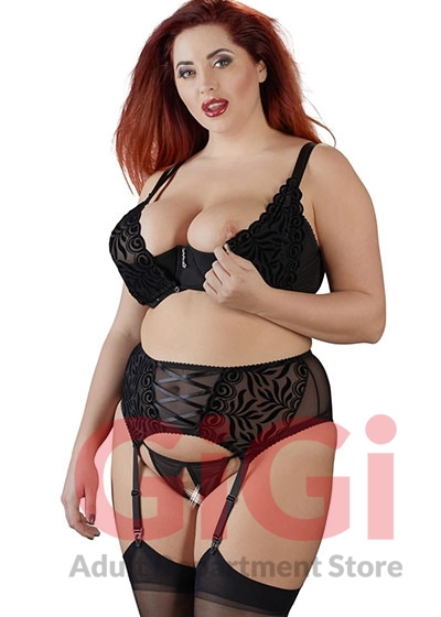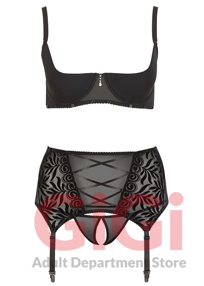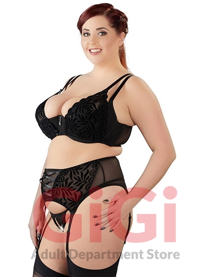 3-piece suspender set made out of powernet with velvet flock print inserts. Includes an underwired bra with wide, double straps and a hook fastener at the back. The cups and straps are removable so that the bra becomes a strapless shelf bra. Rhinestone decoration in the middle of the cleavage adds the perfect finishing touch. The suspender belt has a hook fastener at the back and adjustable suspender straps. A completely crotchless string rounds off this ensemble perfectly.