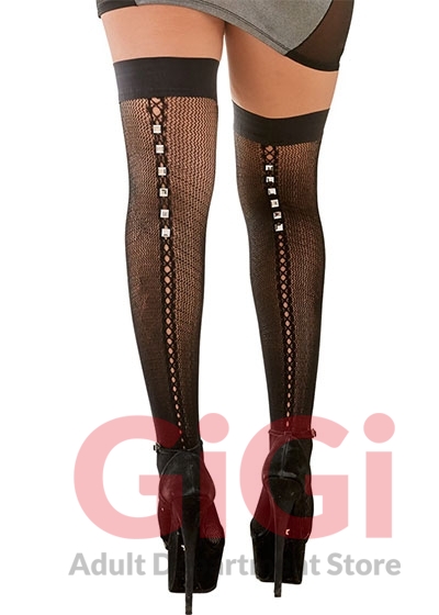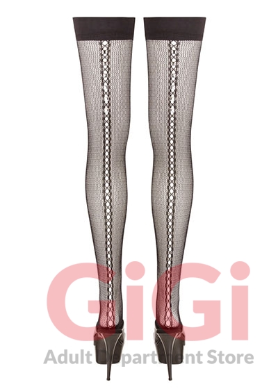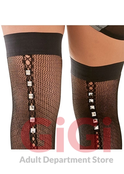 Hold-up stockings with a hole pattern, decorative seam and studs at the back. Made out delicate net material. With a silicone lining for a non-slip fit. A real eye-catcher for any occasion!