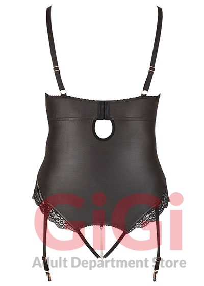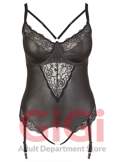 Exciting body with suspender straps, underwired cups and adjustable straps over the cups. There are only 2 straps at either side and a (removable) row of pearls over the open crotch (middle), which will provide sweet stimulation. The 4 suspender straps are adjustable and removable. Made out of trendy matte look material with lace inserts at the front and around the legs. 92% polyester, 8% spandex; lace 90% polyamide, 10% spandex. Without stockings.