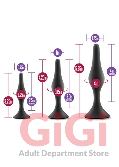 •SIZE - 3 Graduated Plugs Make Sizing Up Simple: Small: 3.25 Inch Length (2.5 Inch Insertable) x .75 Inch Width Medium: 4.25 Inch Length (3.5 inch Insertable) x 1 Inch Width Large: 5.25 Inch Length (4 Inch Insertable) x 1.25 Inch Width