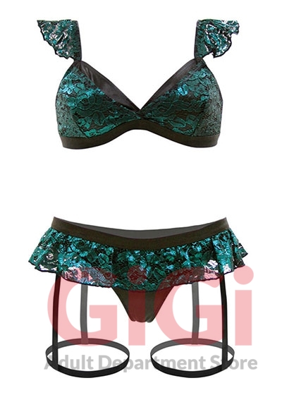 Our covetous Shades of Envy ruffle bra and matching skirted panty set is awash in shimmering emerald metallic lace. Flutter shoulder straps and ruffle finishes add a touch of girly flair to this jewel-toned set.