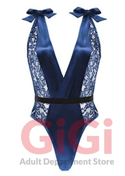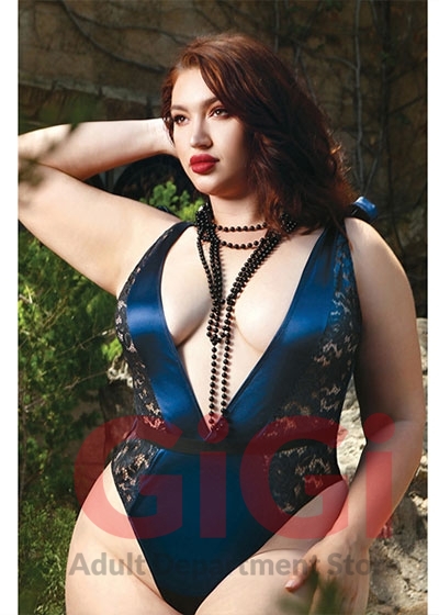 Match the fire of longing with the chill of serenity in our Frostbite teddy. Shimmer royal blue teddy made of lustrous satin is accented with black and metallic lace detailing. Satin shoulder ties are featured, allowing you to decide how much you want to reveal. Finished with a belted waistline, this garment was made to accentuate and showcase your delectable figure.