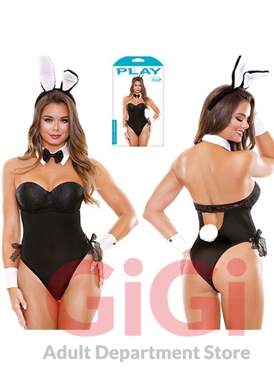 You’ll Hef to see this 4 piece set to believe it. Includes Black lace-up teddy with hook & eye closure and a keyhole back, Poseable ear headband, and bowtie collar & cuffs. Nobunny does it better!