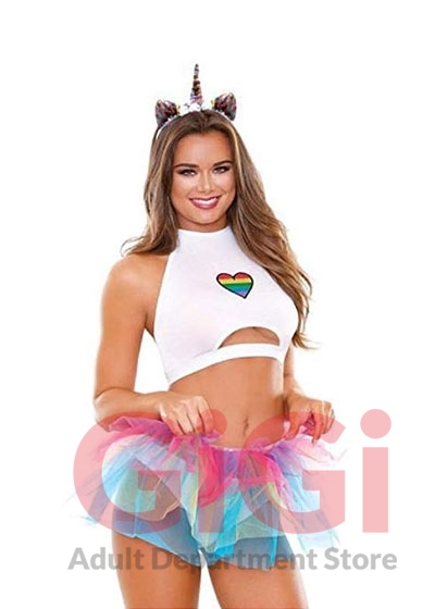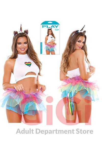 A creature so rare that it can usually only be found in your dreams. Well, dream no more. 4 piece set comes with Crescent keyhole top, rainbow mesh skirt, tailed panty, and matching headband.