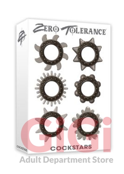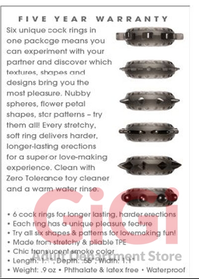 Six unique cock rings in one package means you can experiment with your partner and discover which textures, shapes and designs bring you the most pleasure. Nubby spheres, flower petal shapes, star patterns, try them all! Every stretchy, soft ring delivers harder, longer lasting erections for a superior lovemaking experience. Clean with Zero Tolerance toy cleaner and a warm water rinse. 6 cock rings for longer lasting, harder erections. Each ring has a unique pleasure feature. Try all six shapes and patterns for lovemaking fun! Made from stretchy and pliable Thermoplastic Elastomers TPE. Chic translucent smoke color.