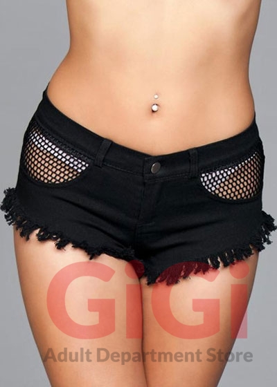 Denim shorts with fishnet top trimming and fringe bottom details. Poly bag packaging. Packaging dimensions (in): 13x10x1.