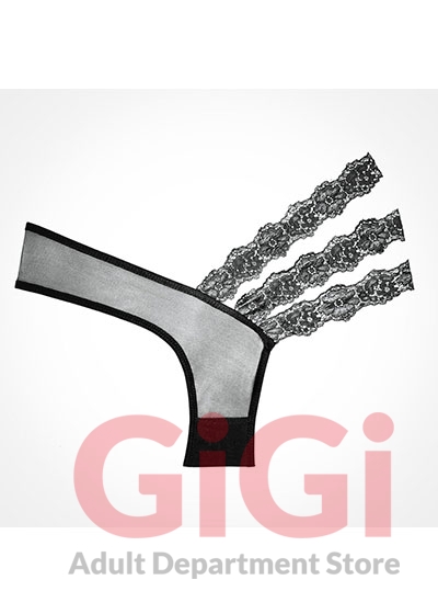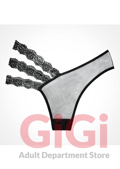 Asymmetrical sheer panty with blossoming triple lace side bands.
