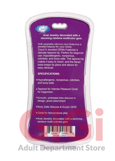 Anal Jewelry decorated with a stunning rainbow multicolor gem. Silver chromed wearable silicone plug featuring a jeweled beauty for your booty. Cloud 9 Jeweled GEMs Features a delicate tapered tip. Perfect for beginner use. Hypoallergenic, nonporous, odorless, and body-safe. The tapered tip makes it easy to insert, and the flared base keeps its place and allows for easy retrieval. The sparkling jewel makes playtime fun. This Cloud 9 Jeweled Anal Plug is excellent for temperature play when you prepare it in hot or cold water. This Cloud 9 GEM anal plug is both visually stunning and ideal for stimulating anal play. Compatible with water based lubricants. Clean with mild soap and warm water after use. Easy to clean (top rack dishwasher safe)