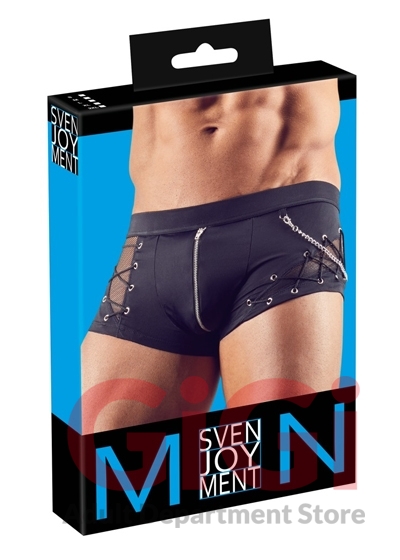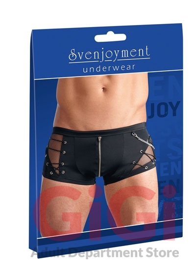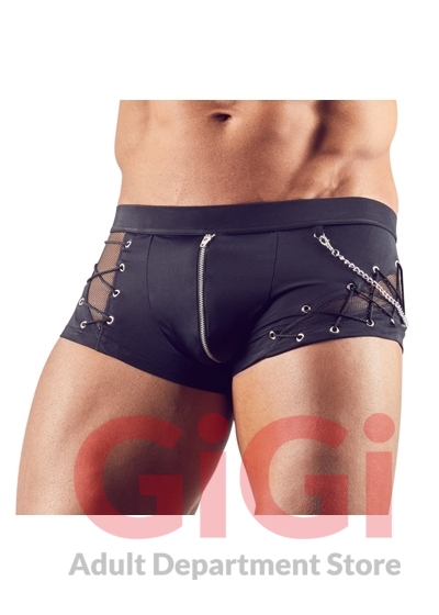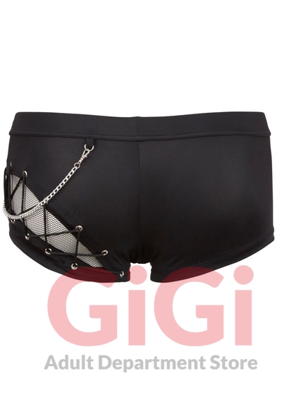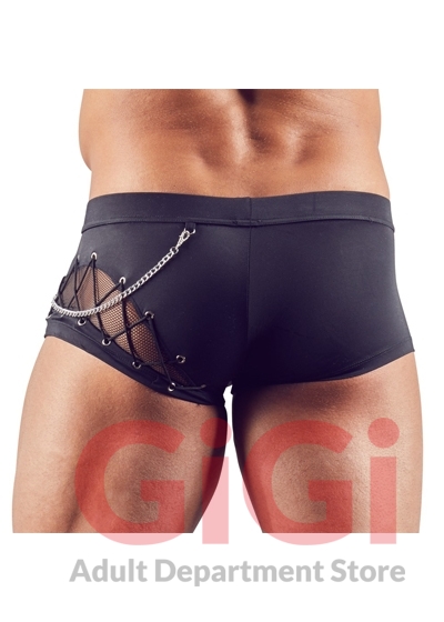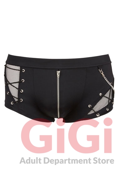 Pants made out of a trendy combination of opaque and transparent (fishnet) material. With a removable decorative chain and zip at the front. Black. Very stretchy.