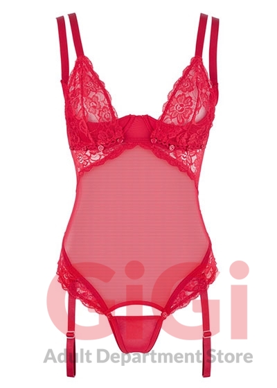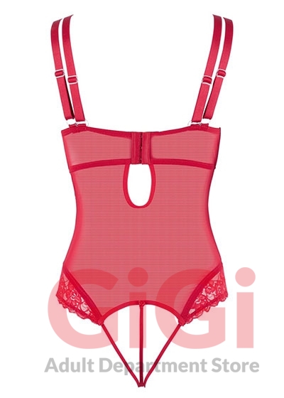 Red body made out of soft, stretchy powernet and delicate lace. The lace cups and one pair of straps can be removed, leaving only a shelf bra. All four straps are adjustable. The string part with cotton gusset can also be detached - there only remain stretchy straps over the open crotch. At the front with two adjustable and removable suspender straps.
