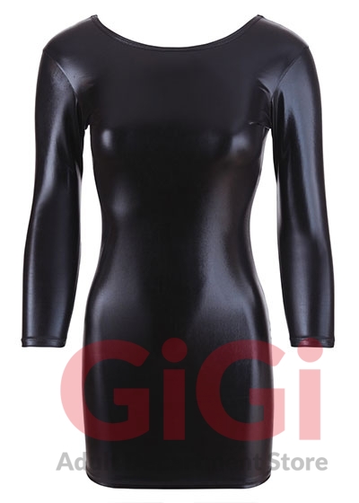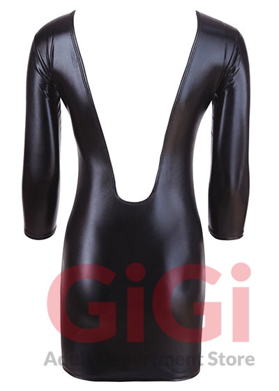 Mini dress with 1/2 sleeves made out of shiny wet look with a round, high-neck neckline. It is low-cut at the back.
